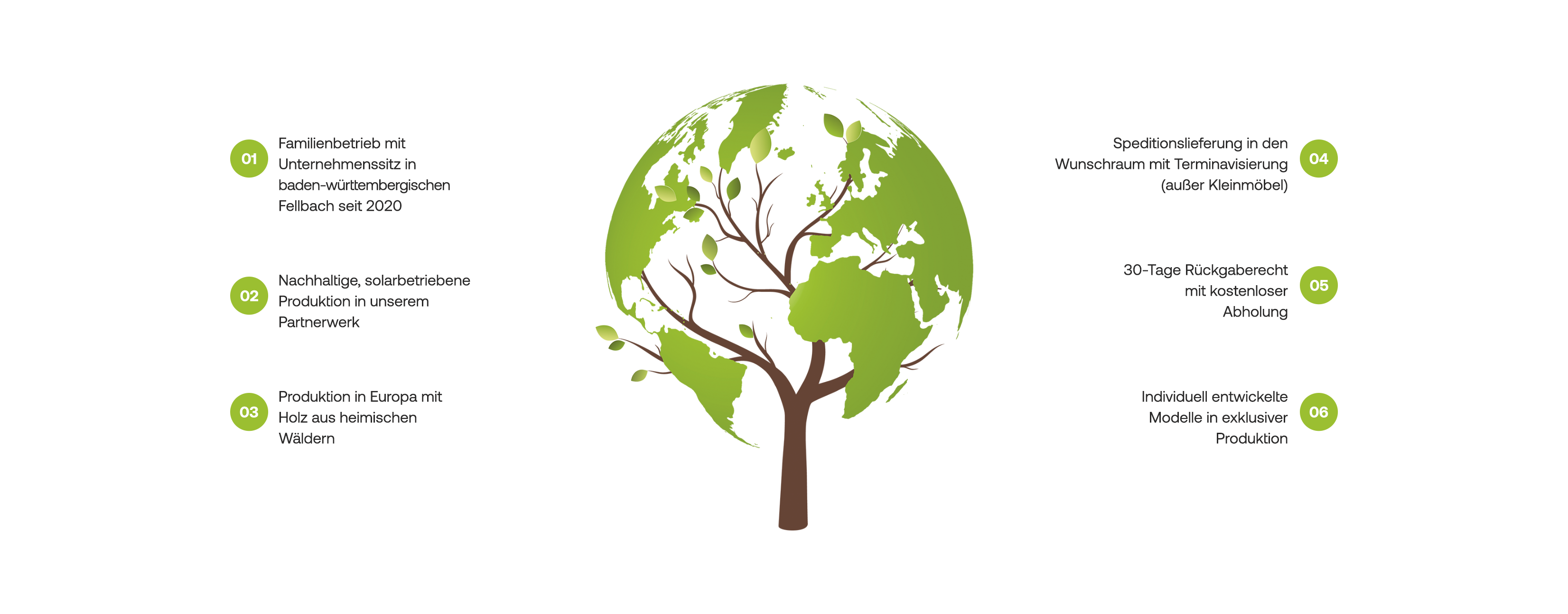 Seit unserer Gründung setzen wir auf Qualität, Nachhaltigkeit und zeitloses Design, um Ihr Zuhause noch schöner zu machen. Für unsere Massivholzmöbel verwenden wir Holz aus nachhaltig bewirtschafteten Wäldern Europas. Durch die kurzen Transportwege schonen wir die Umwelt und reduzieren Emissionen.
