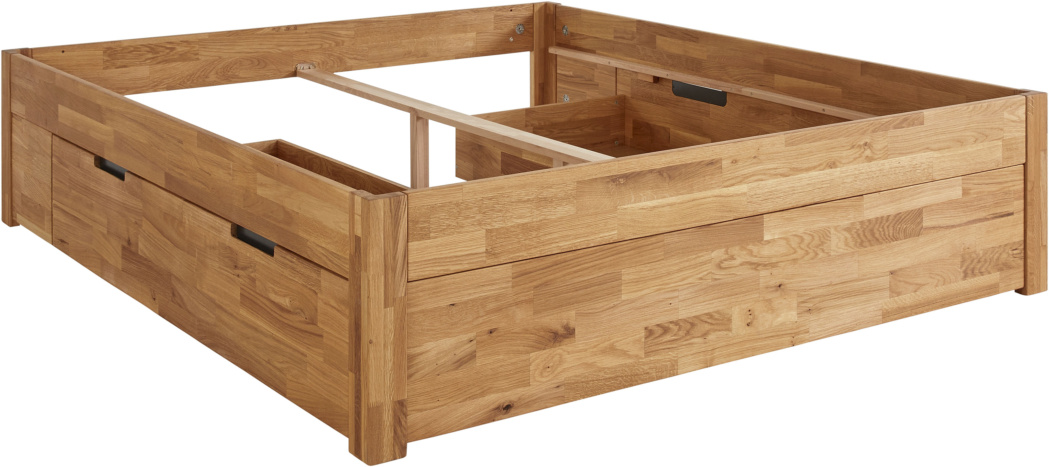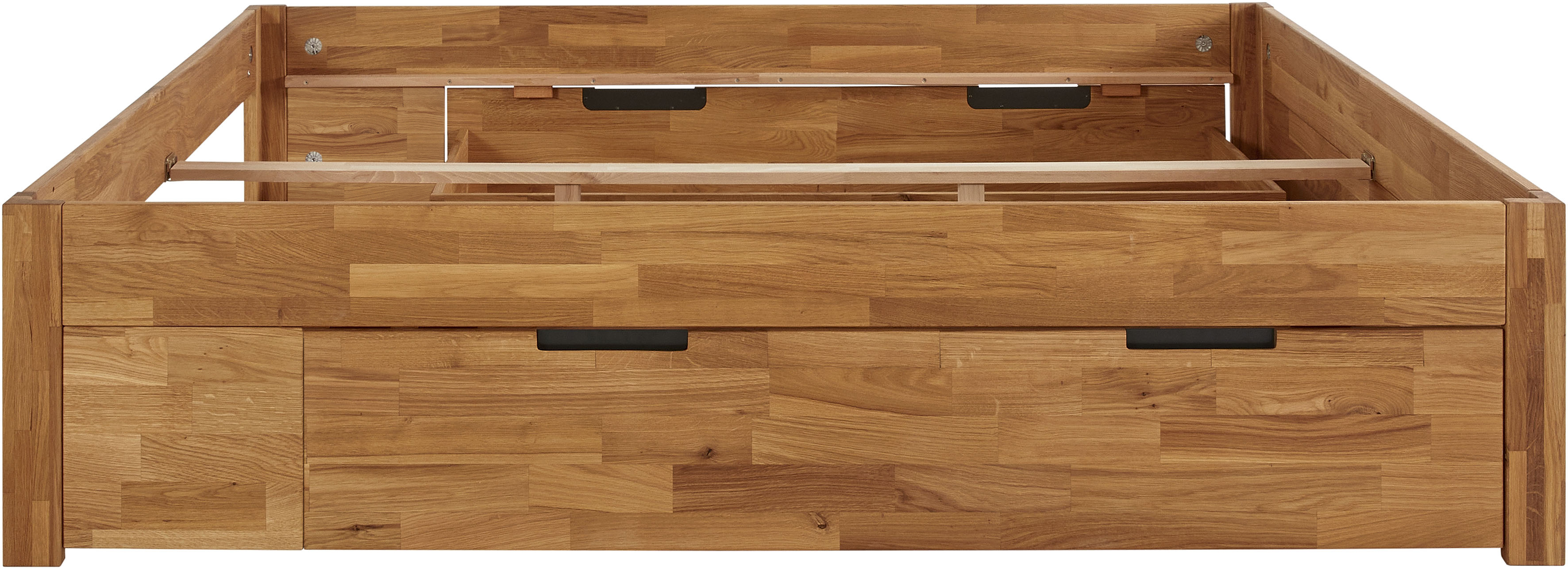 Bett "Santos" ist bis auf die Schubladenböden komplett aus Massivholz, die Schubladengriffe haben eine Verblendung aus schwarzem Blech.