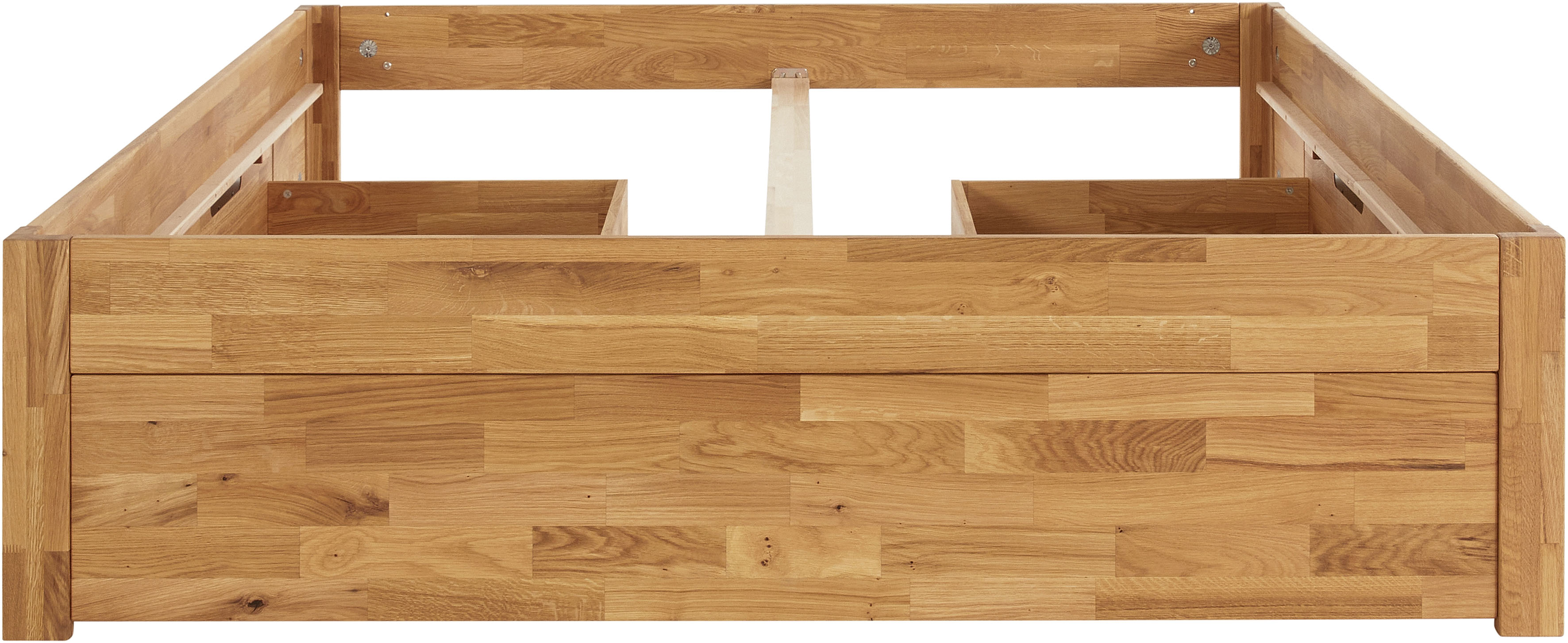 - Blende am Fußteil vom Bettrahmen, die das Innenleben der Schubladen verdeckt und das Bett kompakt erscheinen lässt