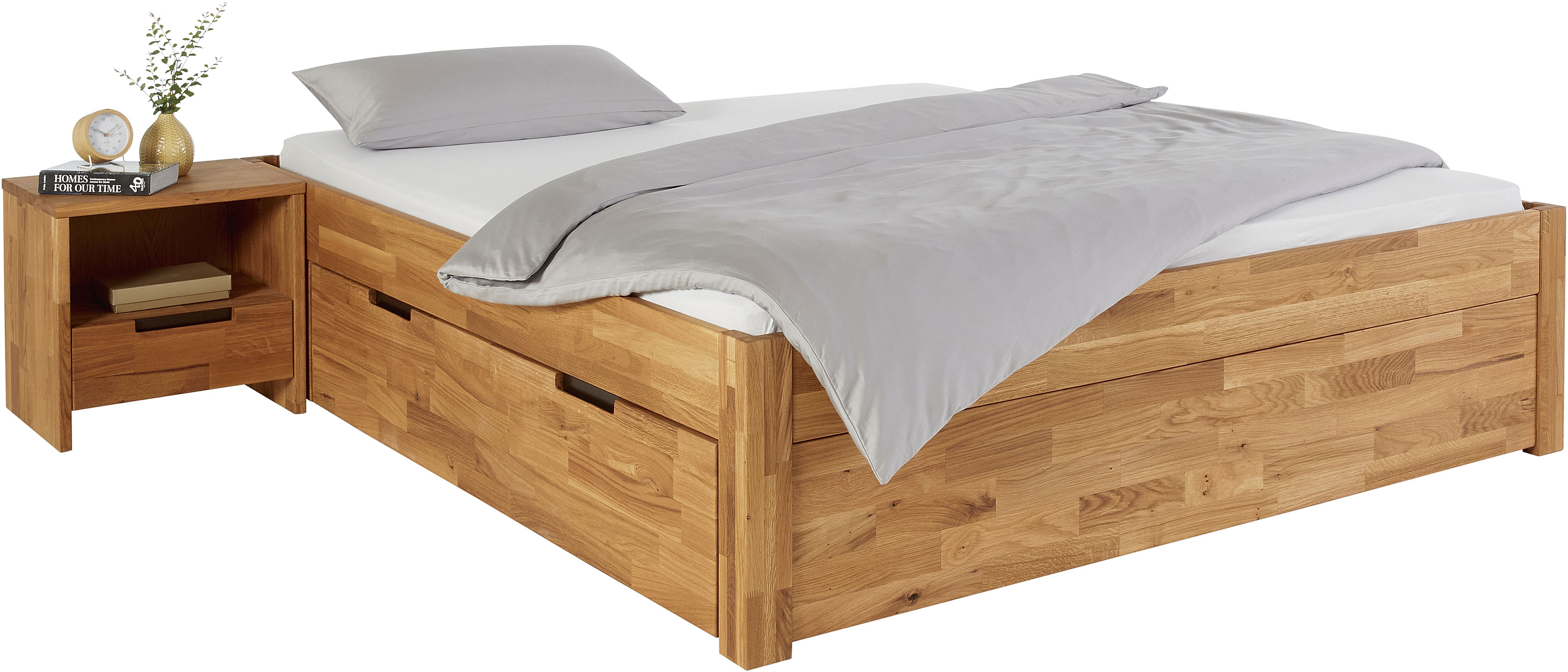 Das mit Naturöl veredelte Eichenholz sorgt für eine natürliche Atmosphäre in Ihrem Schlafzimmer. Als besonderer Blickfang dienen die modernen Schubladen-Handgriffe aus schwarzen Blech, die sich sowohl an den Bettschubladen wie auch an den Schubladen der Nachtkommode wiederfinden. Die Nachttische können separat bestellt werden.
