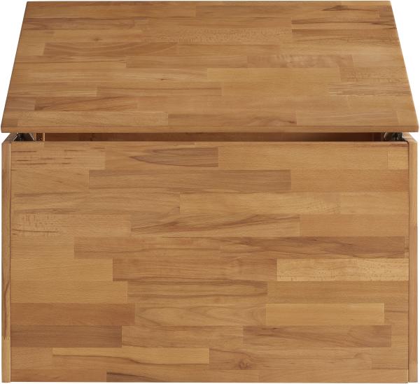 Diese hochwertige Truhe aus massivem Kernbuchen- oder Wildeichenholz geölt, vereint warme Naturoptik mit praktischer Alltagstauglichkeit. Die feine Ausfräsung am Griff sorgt nicht nur für eine moderne, klare Linienführung, sondern ermöglicht auch ein komfortables Öffnen des Deckels.